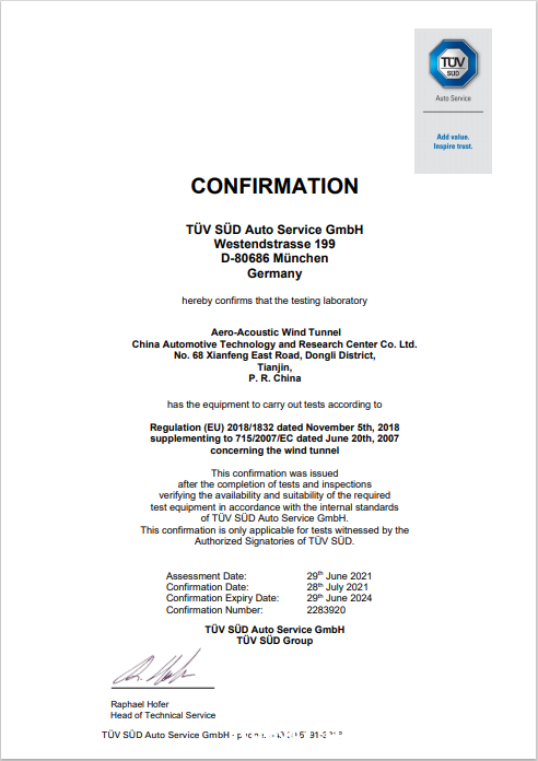 整個(gè)認(rèn)證工作由南德認(rèn)證檢測(中國)有限公司(TUV SUD)完成,經(jīng)過實(shí)驗(yàn)室審查和目擊實(shí)驗(yàn),中汽中心風(fēng)洞中心氣動(dòng)聲學(xué)風(fēng)洞(AAWT)各項(xiàng)指標(biāo)均滿足且超過法規(guī)要求,可提供精確可靠的測試結(jié)果。