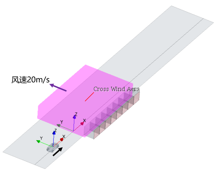 根據(jù)實(shí)際的側(cè)風(fēng)測(cè)試試驗(yàn)場(chǎng)建立數(shù)字側(cè)風(fēng)試驗(yàn)場(chǎng),可以通過空氣動(dòng)力學(xué)側(cè)風(fēng)穩(wěn)定性仿真分析可在車型開發(fā)的早期階段僅通過車身外表面數(shù)據(jù)(CAS面/A面)以及測(cè)試車速、重心位置(軸荷比)、輪胎側(cè)偏剛度、載荷等信息,模擬實(shí)側(cè)風(fēng)道路試驗(yàn)中車輛的整個(gè)側(cè)偏過程以及風(fēng)區(qū)內(nèi)流場(chǎng)的變化過程,且可為車身外表面優(yōu)化方案的提出提供數(shù)據(jù)支持。