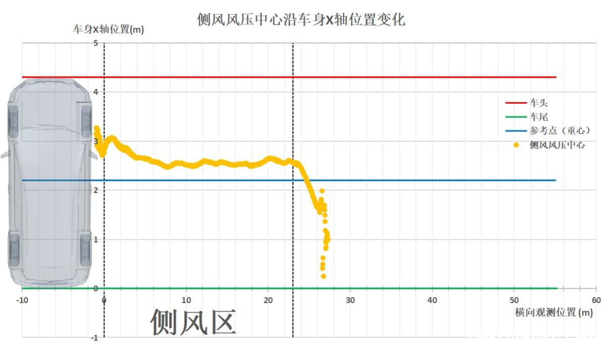數(shù)字側(cè)風(fēng)試驗(yàn)場(chǎng)可以還原真實(shí)的瞬態(tài)測(cè)試過程,可以得到該過程中的流場(chǎng)變化的同時(shí)可獲得車輛在進(jìn)出風(fēng)區(qū)過程中的側(cè)風(fēng)風(fēng)壓中心(即側(cè)向氣動(dòng)力中心)相較于車身位置的實(shí)時(shí)變化。