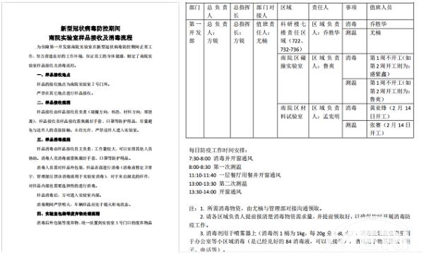 2月5日,疫情防控小組制定《南院實(shí)驗(yàn)室樣品接收及消毒流程》。2月9日,下發(fā)《第1周復(fù)工實(shí)施方案》,明確復(fù)工后座位圖。