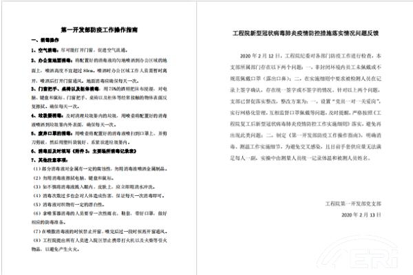 2月11日,黨支部向部門內(nèi)醫(yī)護(hù)人員特別是一線醫(yī)護(hù)人員家屬、社區(qū)工作人員家屬、警察家屬的同事給予關(guān)懷和照顧,解決在生活和工作上的困難。2月12日,針對(duì)工程院紀(jì)委就疫情防控工作的監(jiān)督檢查反饋意見在第一時(shí)間進(jìn)行整改,制訂《第一開發(fā)部防疫工作操作指南》,明確劃分“黨群關(guān)愛小組”,實(shí)行網(wǎng)格化管理,充分發(fā)揮全體黨員的先鋒模范作用,監(jiān)督全體復(fù)工員工佩戴口罩、按時(shí)消毒等工作,帶動(dòng)部門全體員工嚴(yán)格落實(shí)《工程院復(fù)工后新型冠狀病毒肺炎疫情防控工作實(shí)施細(xì)則》。2月20日,黨支部組織全體黨員、入黨積極分子和入黨申請(qǐng)人在學(xué)習(xí)強(qiáng)國(guó)APP線上進(jìn)行關(guān)于習(xí)近平總書記對(duì)于疫情防控的指示批示精神的學(xué)習(xí),并完成相關(guān)專項(xiàng)答題。